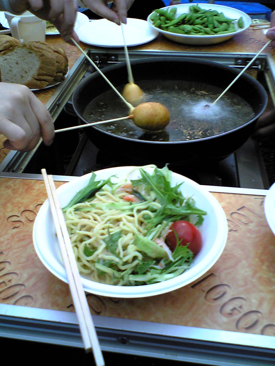 いろんなものを串に刺して、てんぷら粉やホットケーキミックスを絡ませて各自で揚げながら食べます。