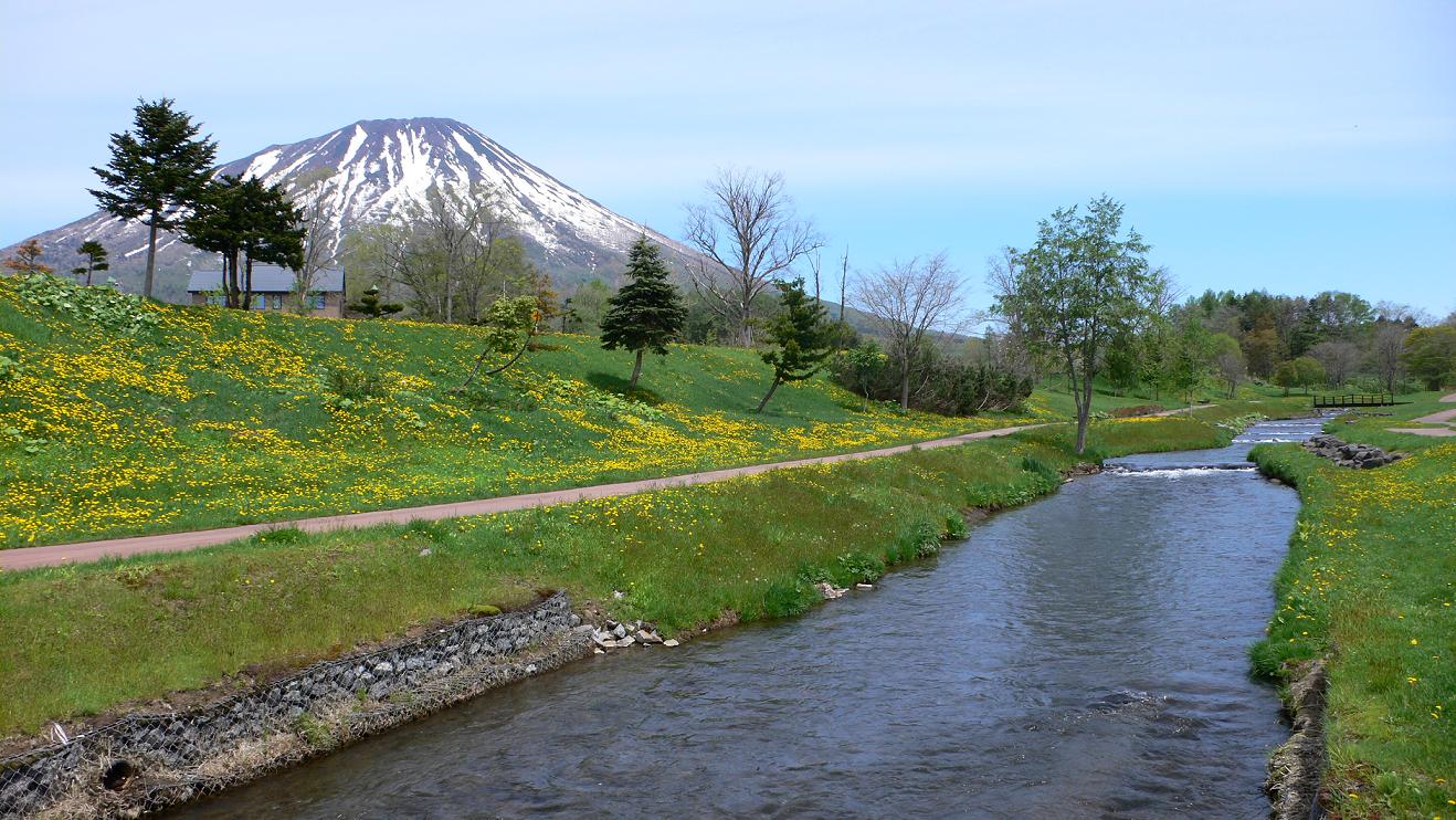 雪が残っている羊蹄山と黄色いタンポポたちが、とってもキレイ