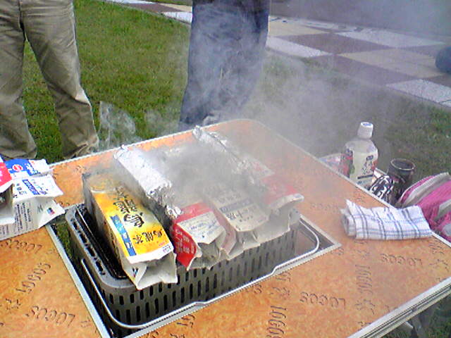 パンにキャベツとソーセージを挟んでアルミホイルでくるくる巻いて新聞で包んで、牛乳パックに入れて燃やします。 こんなやり方初めて見たよ~!!